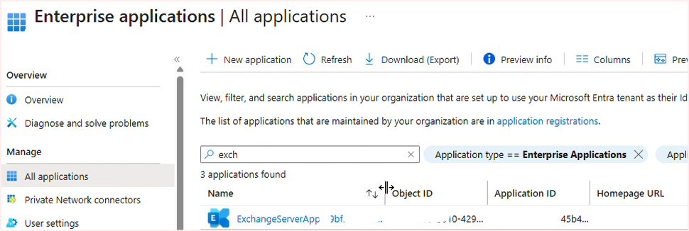 Once the task completed, Exchange Server App will be visible in the Entra Enterprise Applications.