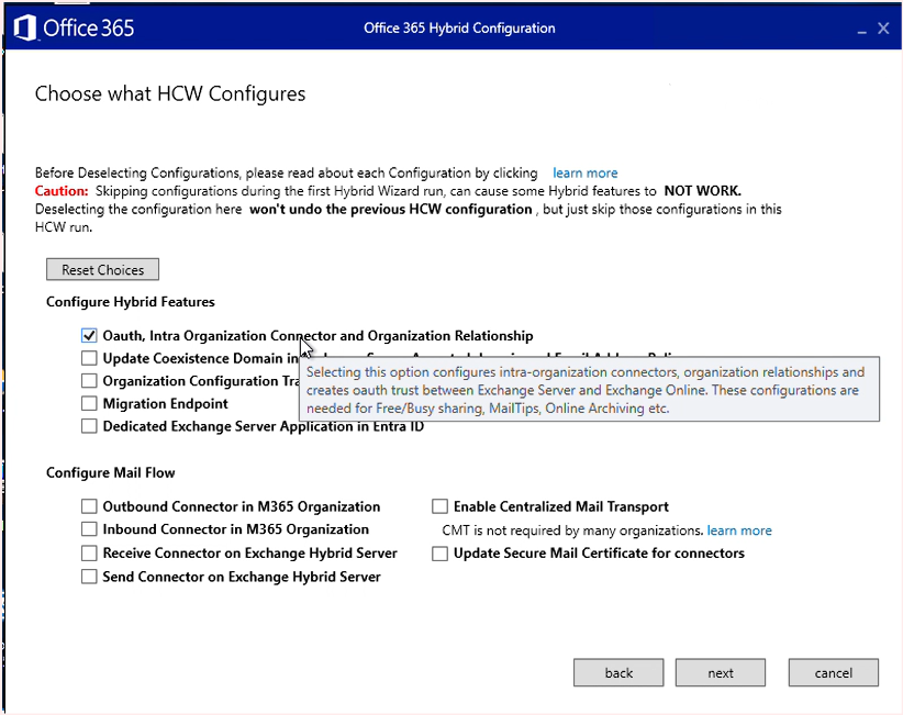 Run the HCW and select the full option and select only “Oauth, Intra Organization Connector and Organization Relationship”